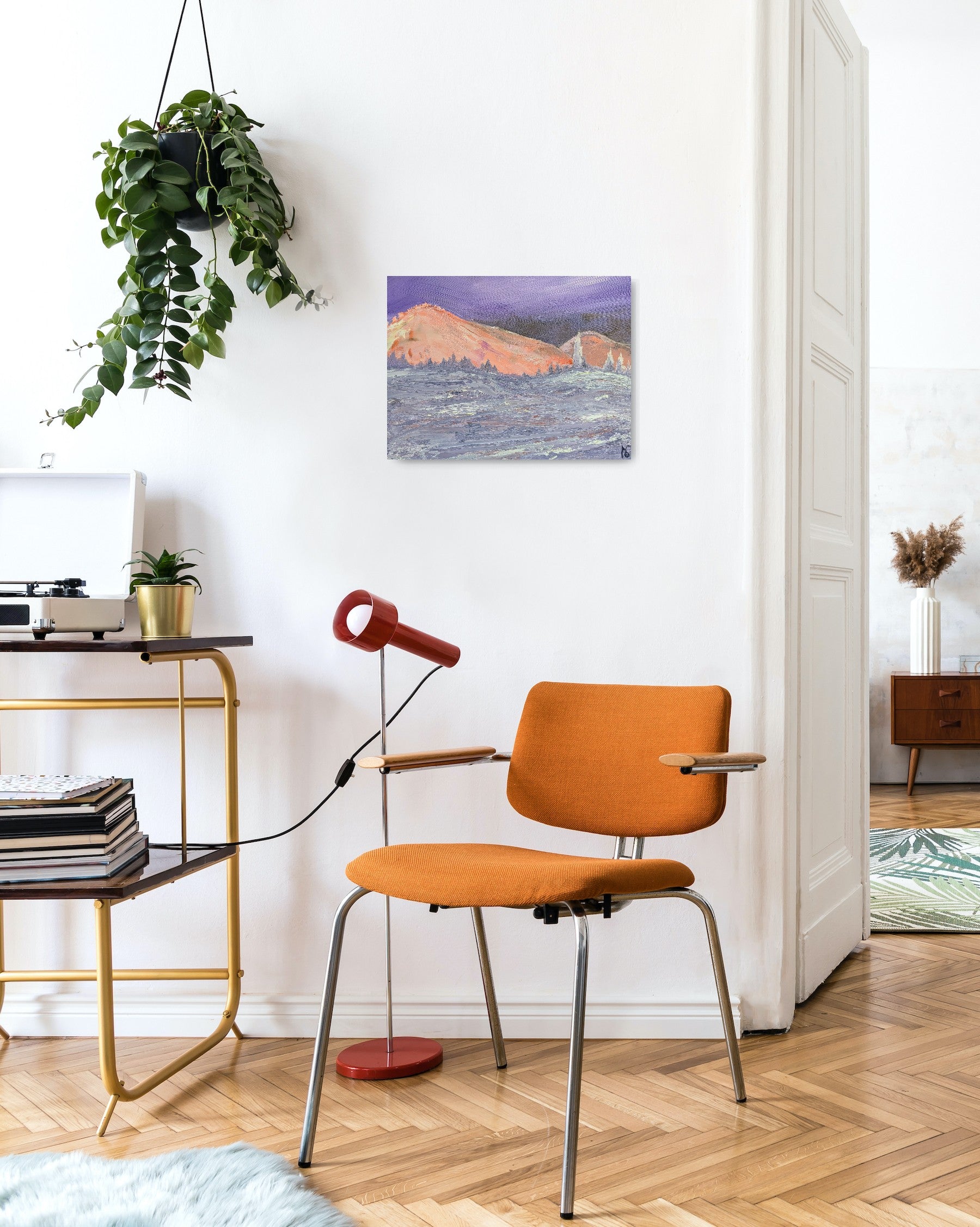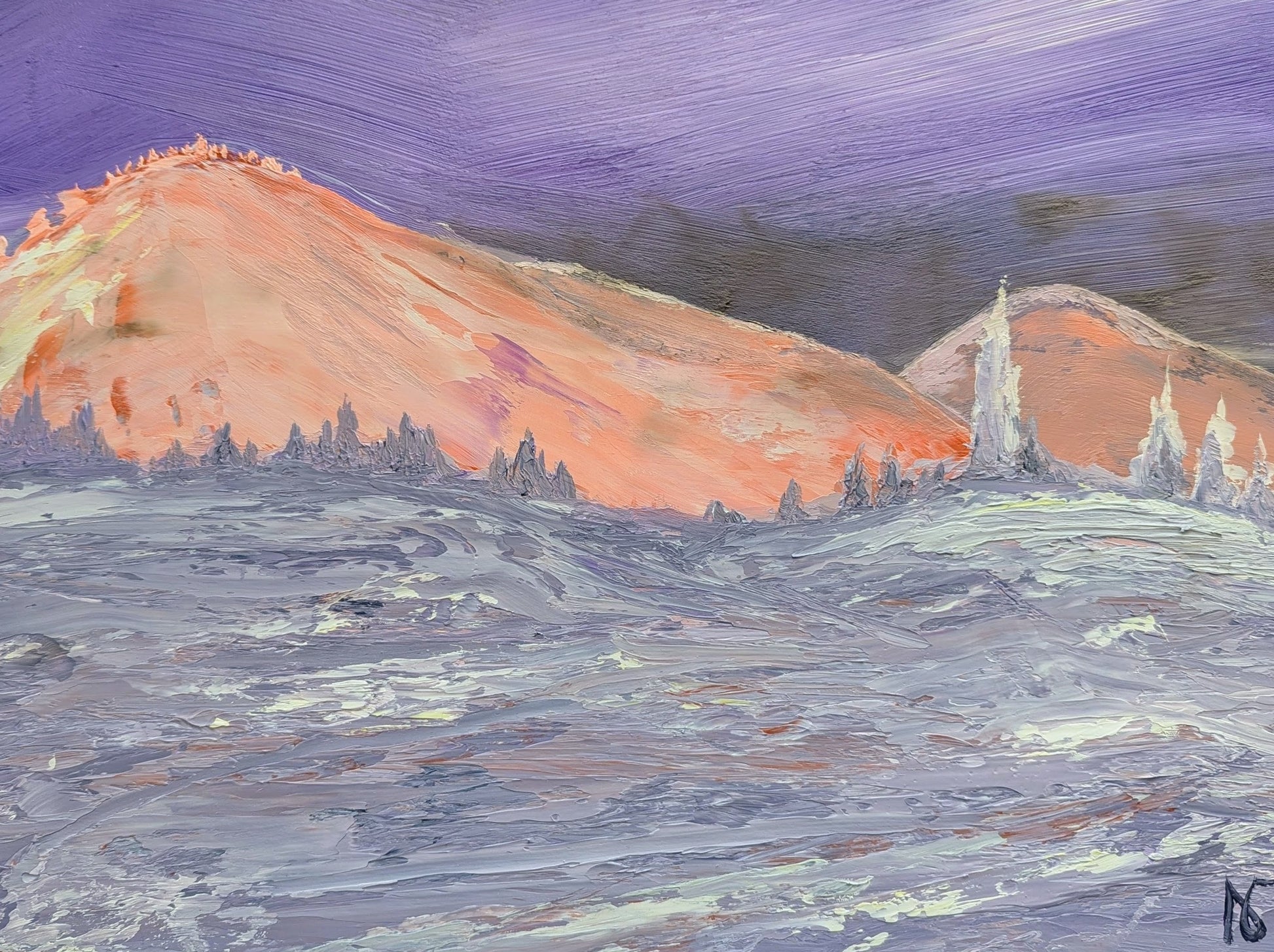 This piece is mostly executed in oil paint, which allowed me to create three distinct texture zones: the sky, the mountains, and the snow in the foreground.