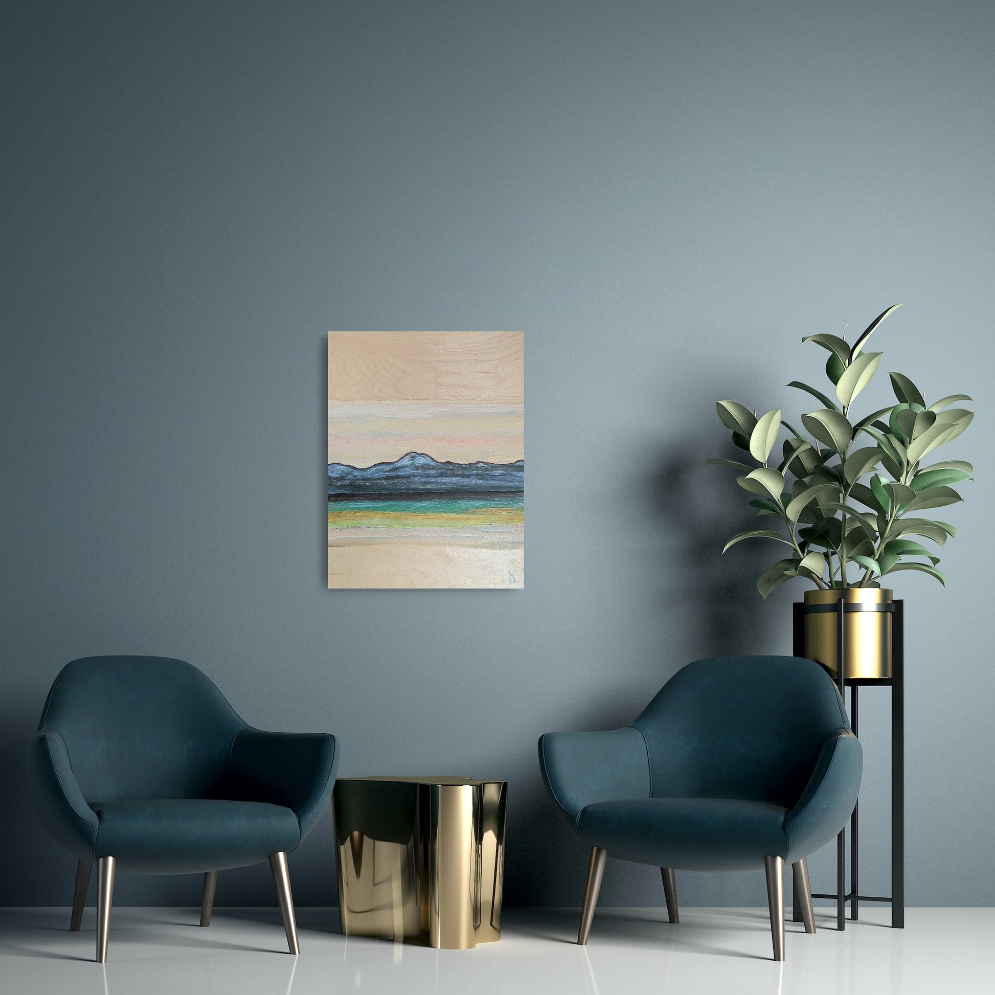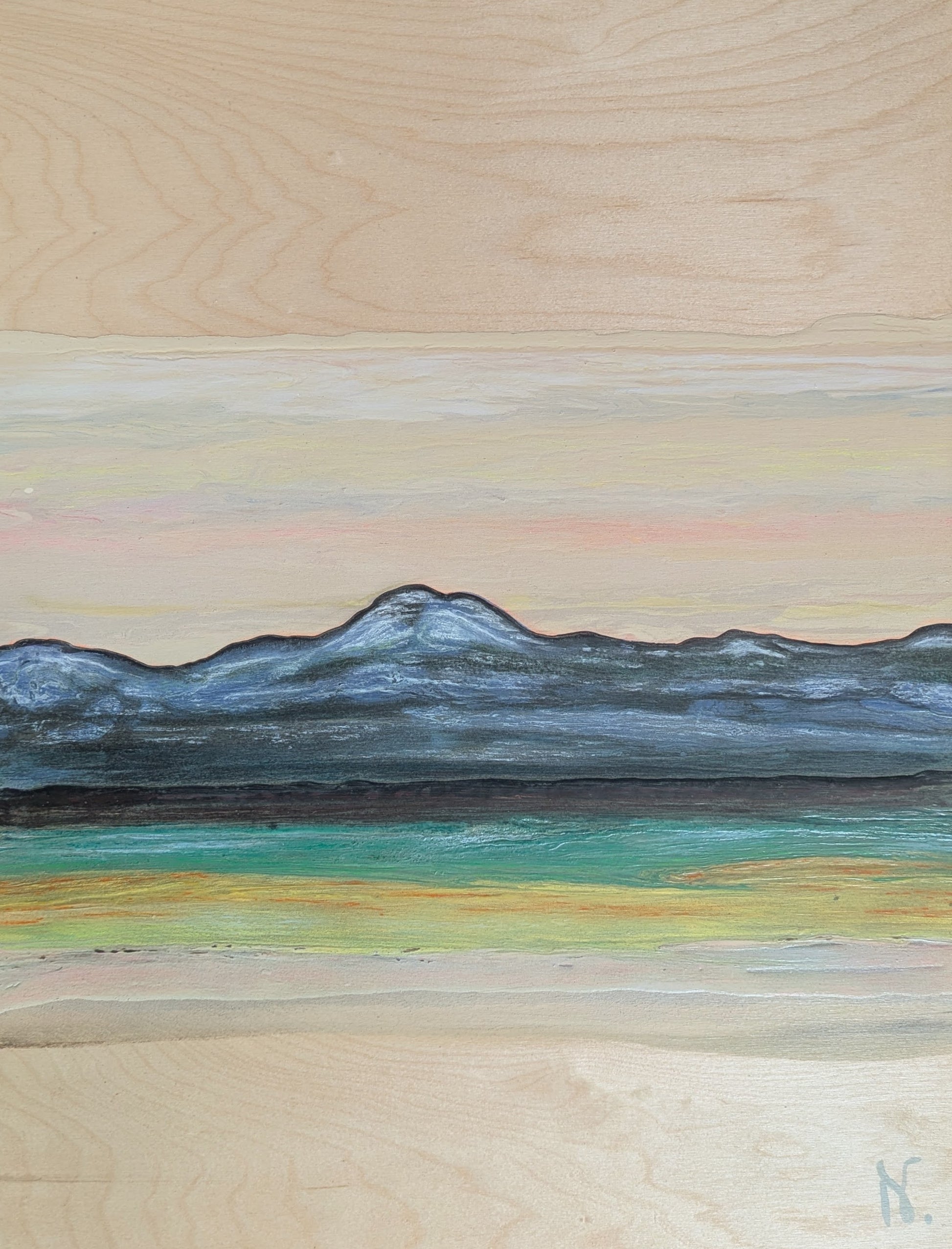 First Blush shows a mountain landscape emerging from the wood of the panel it is painted on. This piece is composed of mostly soft colours: cream and tan, streaked with muted pinks, yellows, and blues. The colour scheme intensifies at the point where the mountain range grows out of the landscape.